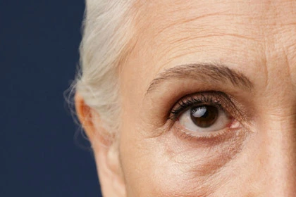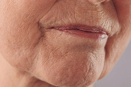 Queda do terço médio, sinalizada por um sulco nasogeneano (bigode chinês) mais acentuado, olheiras marcadas e flacidez palpebral, além perda de volume facial.