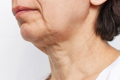 No terço inferior, a linha da mandíbula é alterada pela queda dos tecidos (jolws), com perda de definição entre face e pescoço.
